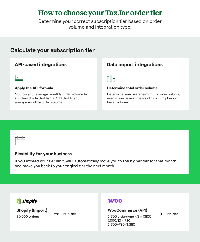 Our monthly and annual subscription pricing is based on your total monthly order volume and how you are integrating with TaxJar.